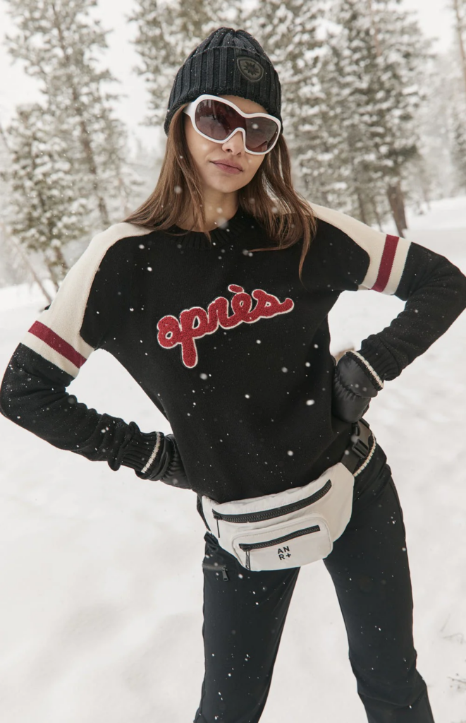 A strong après outfit almost always starts with the sweater, like a classic Fair Isle or Nordic knit for a timeless lodge feel, chunky cable sweaters that pair perfectly with leggings, lightweight cashmere or merino pullovers for easy indoor warmth, or even retro ski graphics for a playful, nostalgic edge. From there, balance it out with comfortable pants or elevated leggings, waterproof or shearling-lined boots for warmth, and accessories that bring both personality and practicality—a beanie, oversized sunnies, even a fun crossbody.